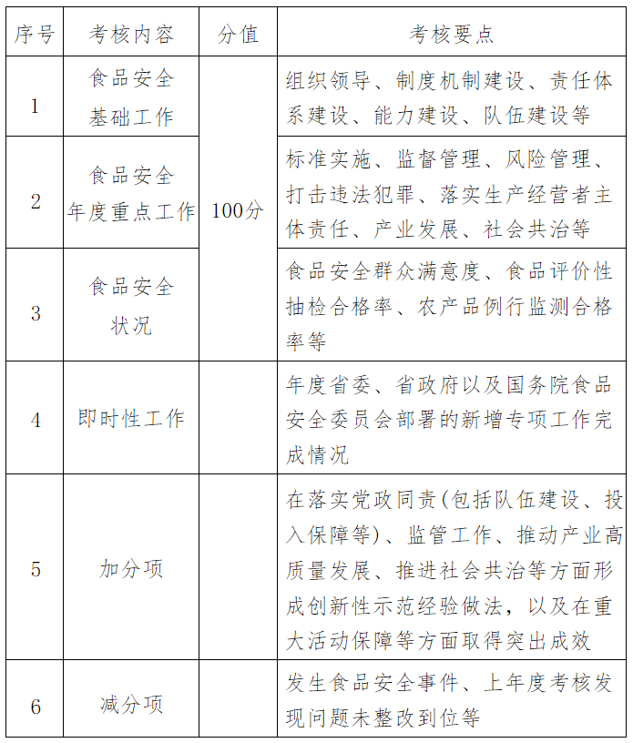 备注:具体考核指标及分值根据年度重点工作进行调整,由省食品安全办在年度食品安全工作考核方案及细则中明确。