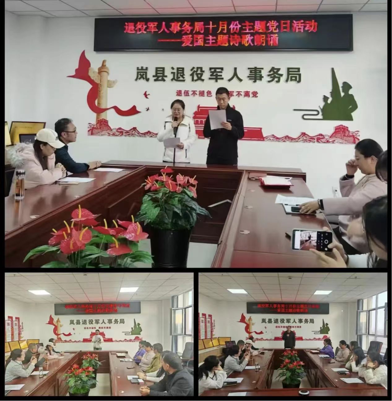 为深入学习贯彻习近平强军思想,厚植党员干部爱国情怀,近日,岚县退役军人事务局举办主题党日爱国诗歌朗诵会,局机关全体人员参加了活动。