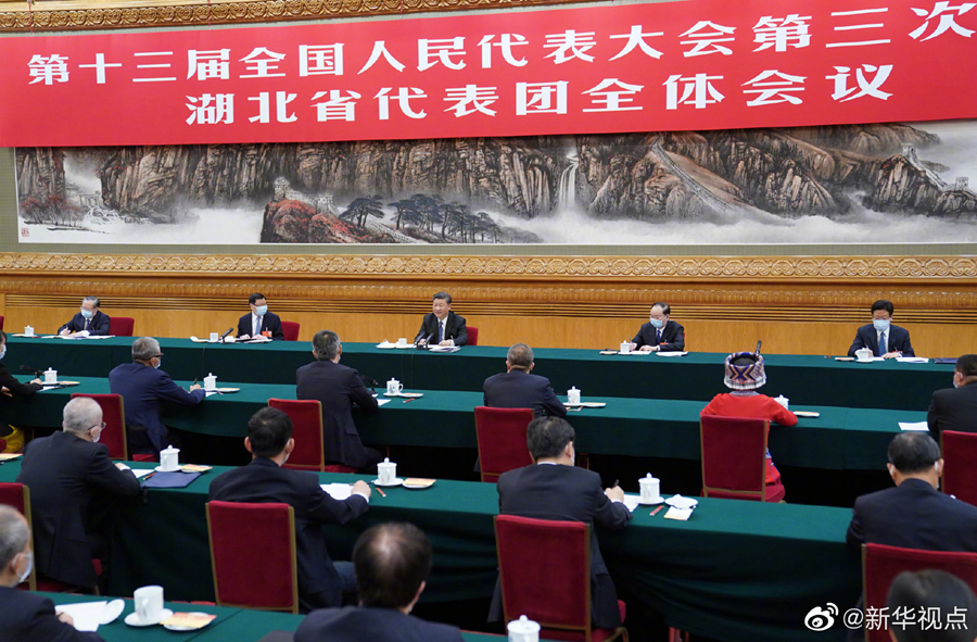 5月24日,中共中央总书记、国家主席、中央军委主席习近平参加十三届全国人大三次会议湖北代表团的审议。 新华社记者 黄敬文 摄