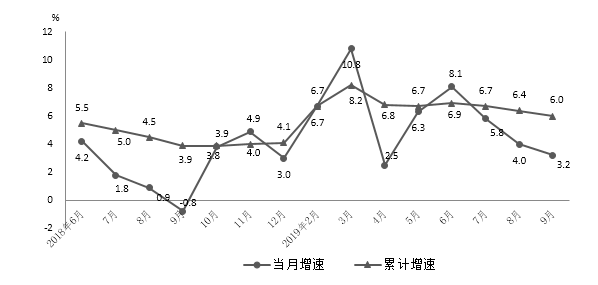 前三季度,全省规模以上工业增加值同比增长6%;其中,9月份增长3.2%。