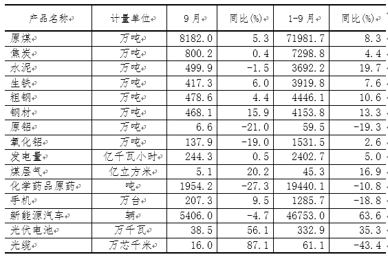 9月份,全省15种主要工业产品产量有10种增长,分别是:光缆增长87.1%、光伏电池增长56.1%、煤层气增长20.2%、钢材增长15.9%、手机增长9.5%、生铁增长6%、原煤增长5.3%、粗钢增长4.4%、发电量增长0.5%、焦炭增长0.4%;5种产品产量下降,分别是:水泥下降1.5%、新能源汽车下降4.7%、氧化铝下降19%、原铝下降21%、化学药品原药下降27.3%。