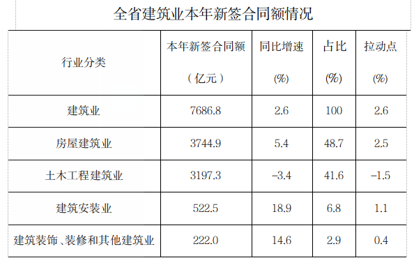 2021年以来,面对复杂多变的市场环境,在省委、省政府的坚强领导下,全省上下紧紧围绕建筑业高质量发展目标要求,统筹疫情防控和经济发展,坚持稳中求进总基调,全力拓展建筑企业发展空间,全省建筑业呈现出快速增长势头。同时也要看到,新签合同额增速不高和建筑业市域发展不均衡等问题,需引起重视。