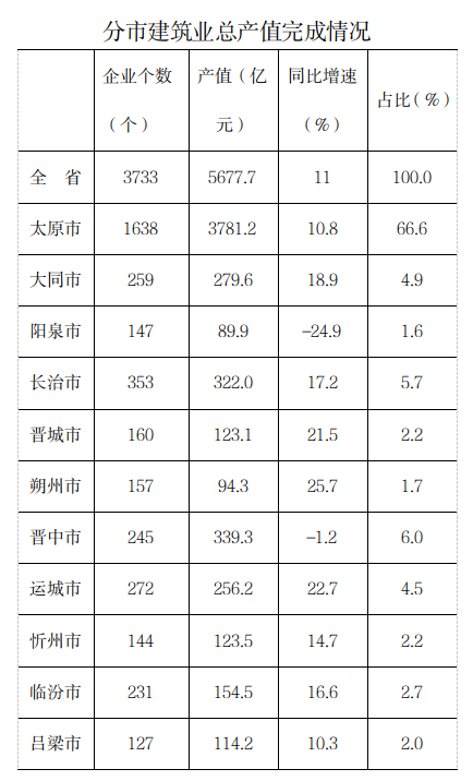 分市看,2021年全省有工作量的总承包和专业承包建筑业企业3733家,共完成建筑业总产值5677.7亿元,其中,太原市1638家企业,占全省建筑业企业的43.9%,完成产值3781.2亿元,占全省建筑业总产值的比重高达66.6%,其他10个市企业数量均不超过400家,完成产值占全省比重均不超过7%。