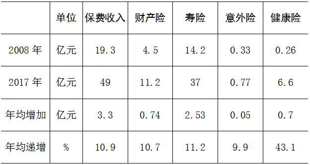 2017年,全市保费收入49亿元,比2008年增长1.5倍,年均增长10.9%。其中,财产险保费收入11.2亿元,比2008年增长1.49倍,年均增长10.7%;寿险保费收入37亿元,比2008年增长1.6倍,年均增长11.2%;意外险保费收入7713.4万元,比2008年增长1.3倍,年均增长9.9%;健康险保费收入6.6亿元,比2008年增长24.2倍,年均增长43.1%。