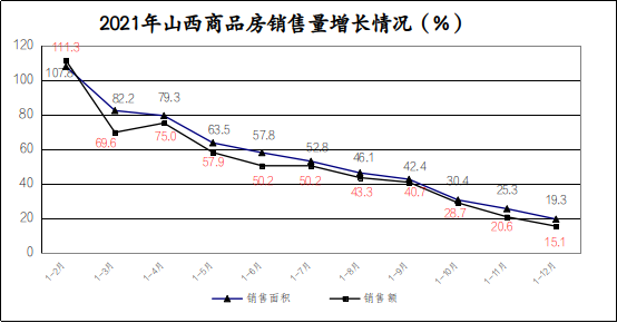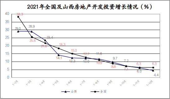今年以来,山西房地产开发投资在上年增速持续加快的基础上呈现出高开低走,渐趋平稳的态势。2021年,全省房地产开发投资完成1945.2亿元,增长6.3%,增幅分别比一季度、上半年、前三季度回落22.6个、6.0个、3.4个百分点,比同期固定资产投资增速低2.4个百分点,比全国平均增速高1.9个百分点。以2019年为基期,两年平均增速为8.4%,增幅比前三季度回落2.1个百分点,比全国平均增速高2.7个百分点。
