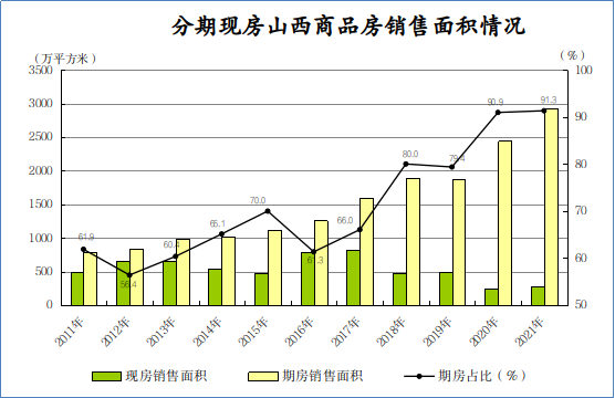 分期现房看,期房销售面积占比进一步提高。2021年,商品房期房销售面积2925.9万平方米,增长19.8%,占商品房销售面积的比重由上年的90.9%提高到91.3%,商品房期房销售额2031.8亿元,增长14.6%,占商品房销售额的比重由上年的94.0%下降到93.6%;商品房现房销售面积278.5万平方米,增长14.6%,占商品房销售面积的比重由上年的9.1%下降到8.7%,商品房现房销售额139.1亿元,增长23.6%,占商品房销售额的比重由上年的6.0%提高到6.4%。