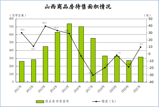 截至2021年底,全省商品房待售面积861.5万平方米,增长9.7%,增幅比上年加快28.4个百分点,结束了连续5年下降态势。其中,商品住宅待售面积517.4万平方米,增长11.4%,增幅比上年加快30.1个百分点;办公楼待售面积21.2万平方米,下降12.3%;商业营业用房待售面积187.4万平方米,增长11.6%,增幅比上年加快34.1个百分点。