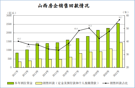 在银行贷款趋紧和自筹资金下降的情况下,本年到位资金仍能有所增长,销售回款成为房企资金流的重要来源。2021年,全省房地产开发企业到位资金2544.4亿元,增长12.3%,增幅比上年加快7.4个百分点。其中,国内贷款113.1亿元,增长4.7%;利用外资0.6亿元,下降84.3%;自筹资金902.7亿元,下降9.6%;定金及预收款970.2亿元,增长27.7%;个人按揭贷款471.7亿元,增长46.4%。以销售回款为主的定金及预收款和个人按揭贷款合计占本年到位资金的比重由上年的47.8%提高到56.7%,所占比重再创新高。