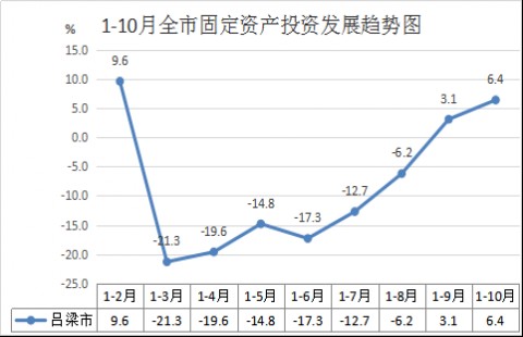 1-10月,全市固定资产投资增速同比增长6.4%,比上半年回升17.5个百分点。(图:1-10月全市固定资产投资发展趋势图)