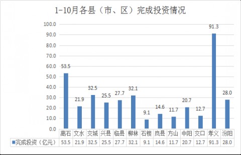 1、从总量看,排前三位的是:孝义市91.3亿元、离石区53.5亿元、交城县32.5亿元,这3个县(市、区)共完成投资177.3亿元,占全市投资的近一半(44.0%);排后三位的是:交口县12.7亿元、方山县11.7亿元、石楼县9.1亿元,这3个县完成投资仅占全市投资的8.2%。(图:1-10月各县(市、区)完成投资情况)