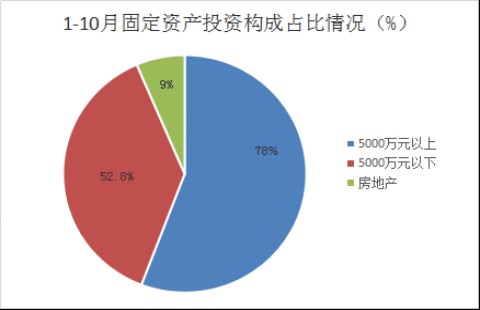 其中:5000万以上项目完成投资316.6元,同比增长12.6%,占全市投资比重78.0%;5000万以下项目投资完成52.8亿元,同比下降21.8%,占全市投资比重13.0%;房地产开发投资完成37.4亿元,同比增长10.8%,占全市投资比重9.0%。(图:1-10月固定资产投资构成占比情况)