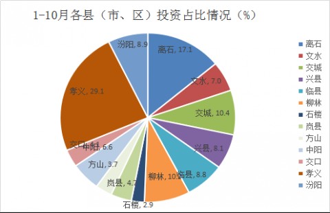 4、从占全市投资比重看,由高到低依次为:孝义市22.5%、离石区13.2%、交城县8.0%、柳林县7.9%、汾阳市6.9%、临县6.8%、兴县6.3%、文水县5.4%、中阳县5.1%、岚县3.6%、交口县3.1%、方山县2.9%、石楼县2.2%。(图:1-10月各县(市、区)投资占比情况)