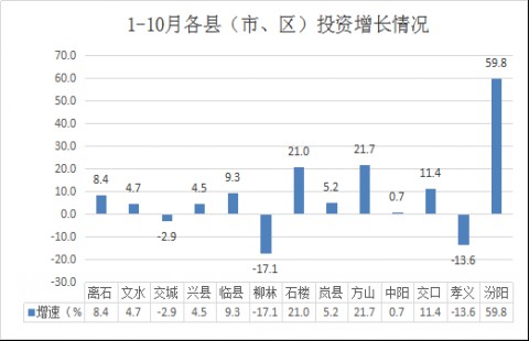 2、从增速看,增速高于全市增速的县(市、区)有6个,分别是:汾阳市59.8%、方山县21.7%、石楼县21.0%、交口县11.4%、临县9.3%、离石区8.4%;增速低于全市增速的县市有7个,分别是:岚县5.2%、文水县4.7%、兴县4.5%、中阳县0.7%、交城县-2.9%、孝义市-13.6%、、柳林县-17.1%。(图:1-10月各县(市、区)投资增长情况)