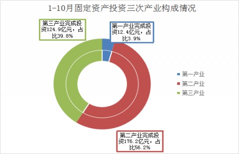 1-10月,全市固定资产投资中,第一产业完成投资17.6亿元,同比下降37.3%;第二产业完成投资222.2亿元,同比增长9.1%。第三产业完成投资167.0亿元,同比增长10.7%。三次产业比重由2017年的7.3:53.2:39.4发展为4.3:54.6:41.1。(图:1-10月固定资产投资三次产业构成情况)