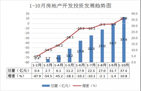 1-10月,全市房地产开发投资完成37.4亿元,同比增长10.8%,增速比上月回升12.2个百分点。房屋待售面积27.7万平方米,同比下降62.2%。(图:1-10月房地产开发投资发展趋势图)