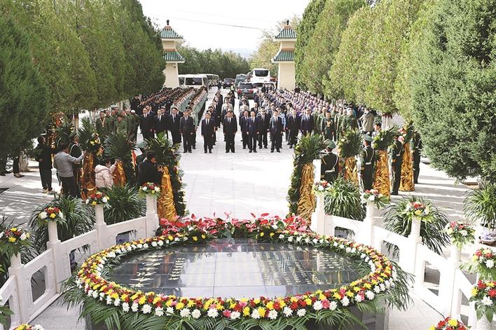 九月三十日,孙大军、张广勇等市领导来到凤山烈士陵园,与社会各界代表一起向烈士敬献花篮。 记者 王益炜 侯利军 摄