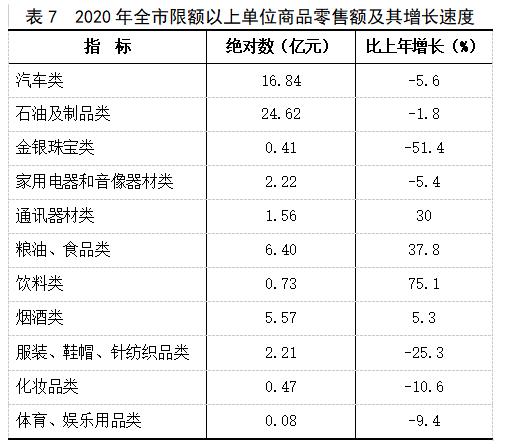 全年全市限额以上单位消费品零售额79.06亿元,下降3.3%。其中,限额以上单位网上零售额1.39亿元,增长20.2%。