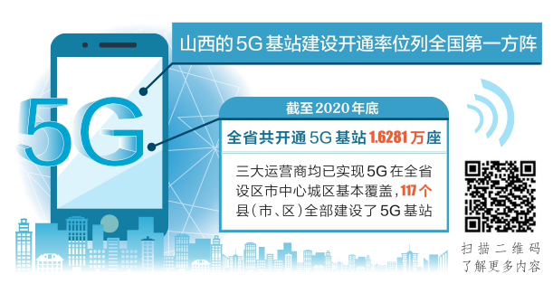 首先,山西的5G基站建设开通率位列全国第一方阵。截至2020年底,全省共开通5G基站1.6281万座。三大运营商均已实现5G在全省设区市中心城区基本覆盖,117个县(市、区)全部建设了5G基站。