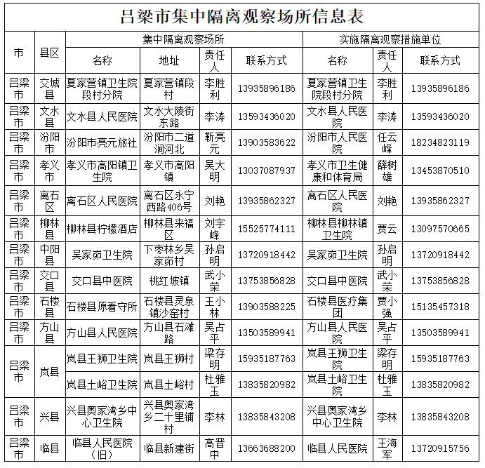 为进一步做好武汉来吕返吕人员的隔离观察,为不具备家庭隔离条件或外地流动人员提供集中隔离便利,设立了14个集中隔离点,现将各县市区设立的集中隔离点相关信息通告如下:(附:吕梁市集中隔离观察场所信息表)