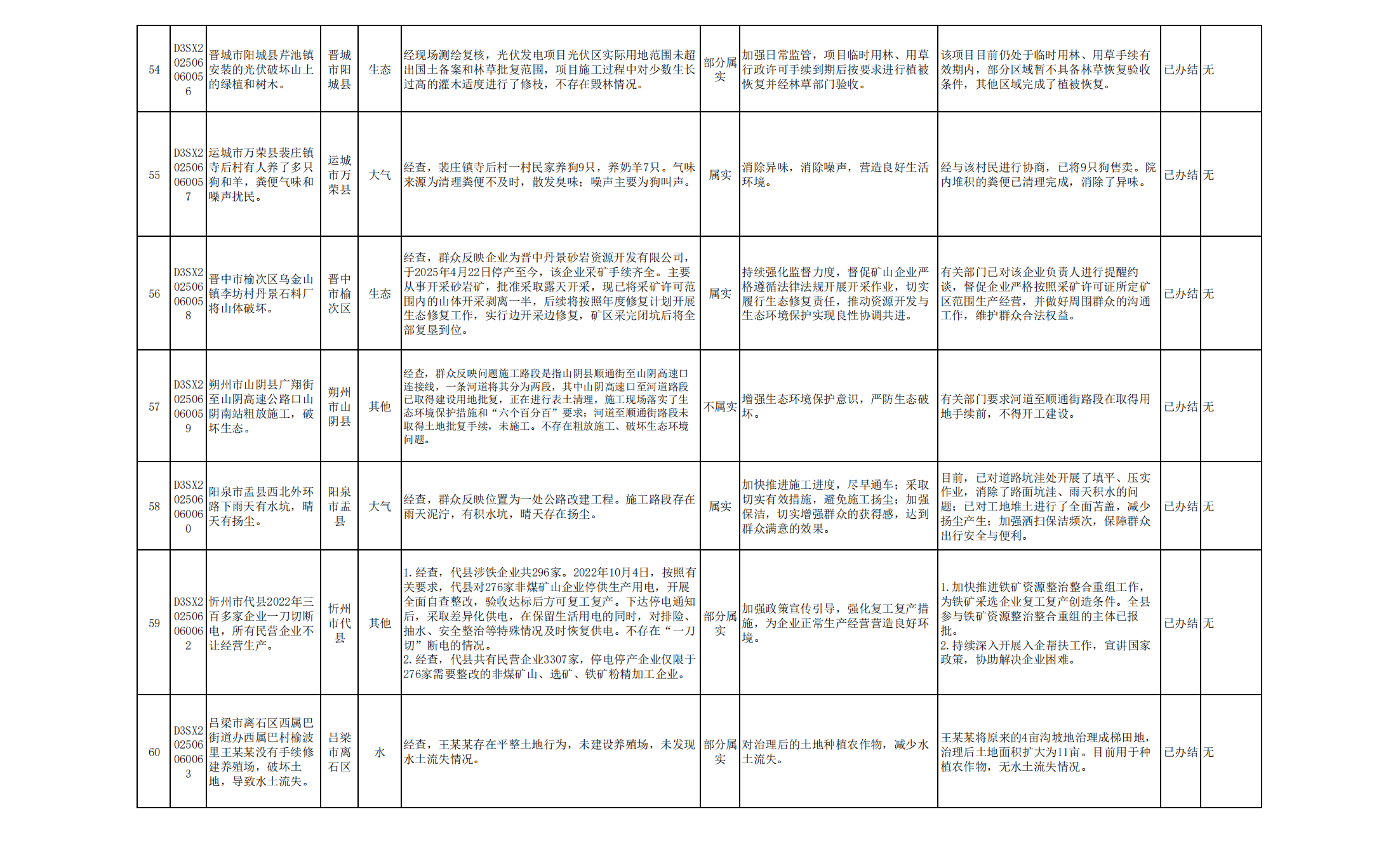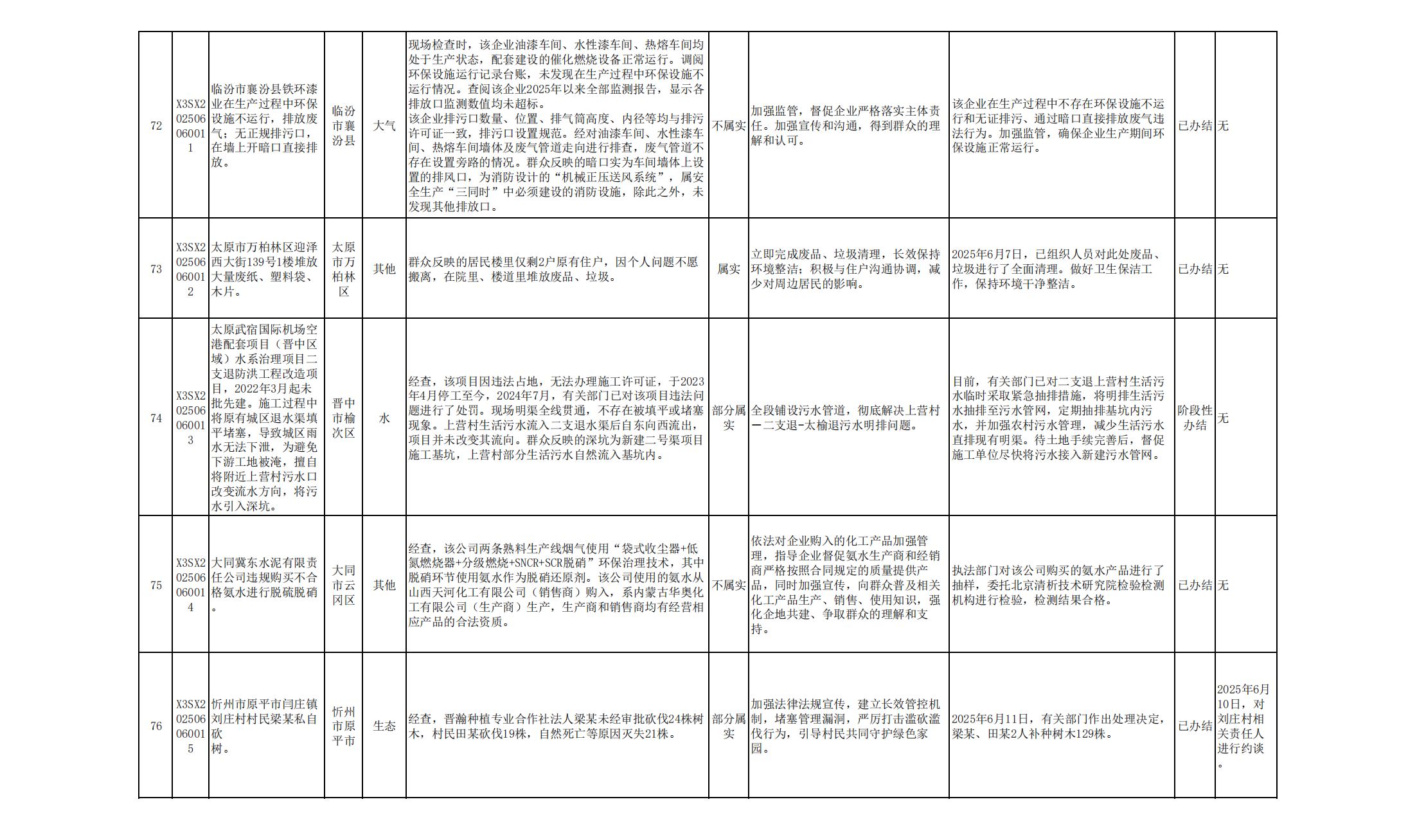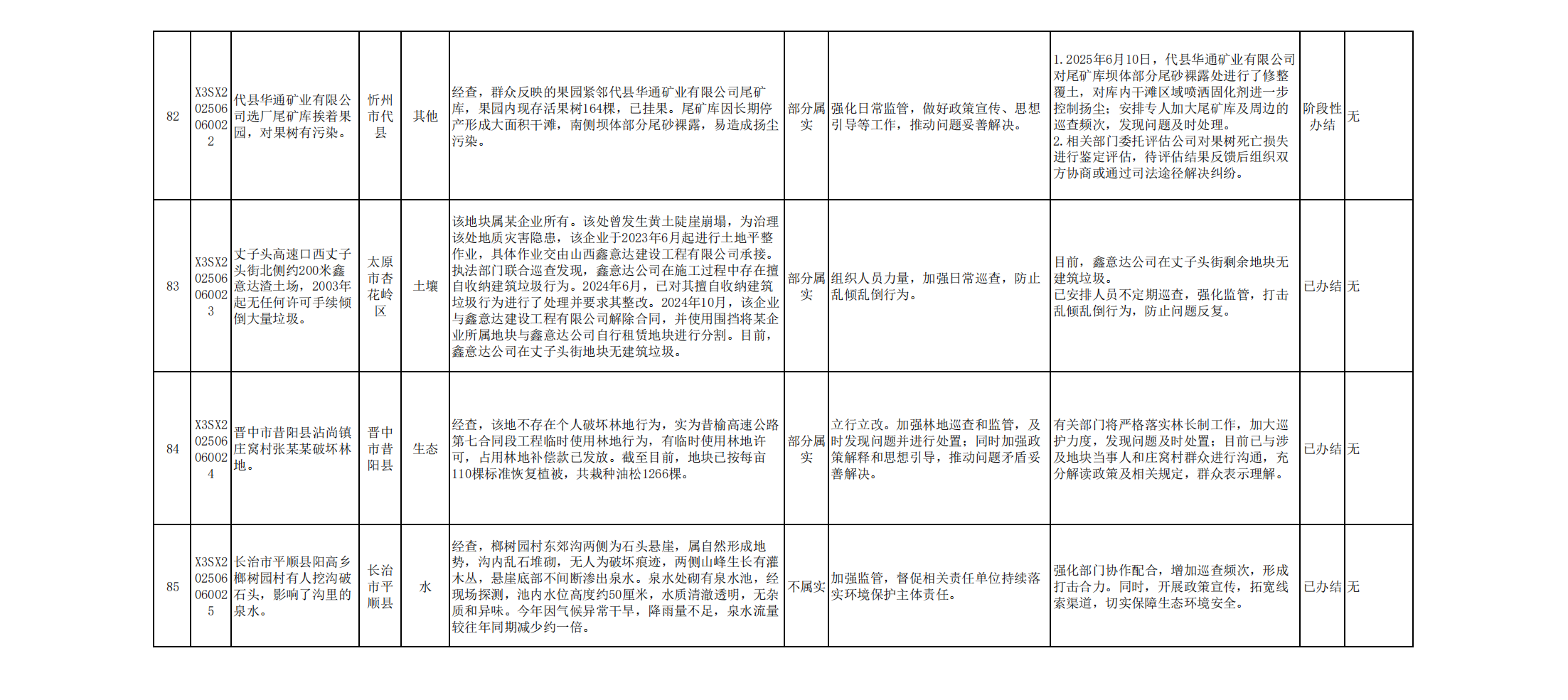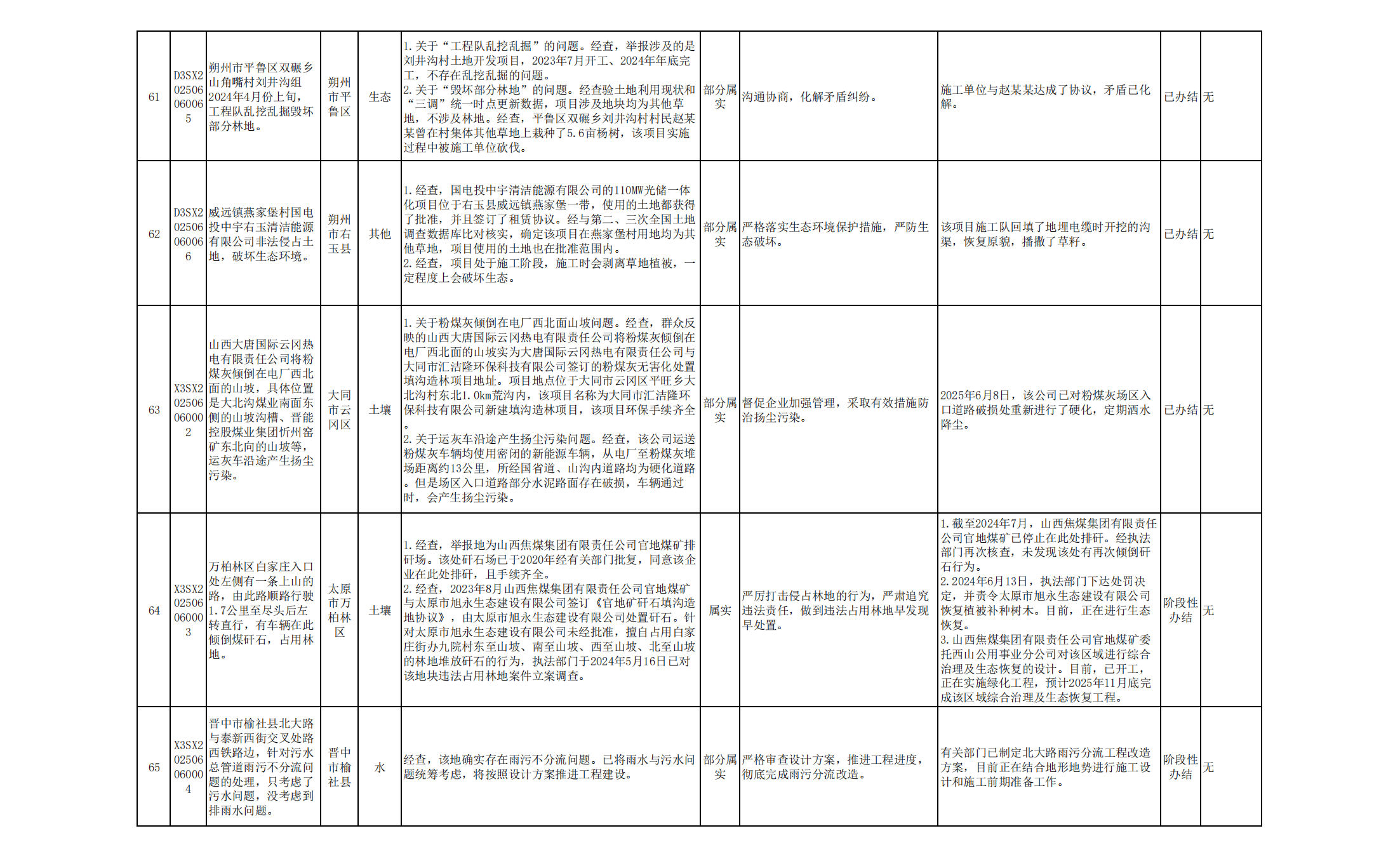 截至2025年6月15日,中央第一生态环境保护督察组向我省交办的第十批群众信访举报件86件,各责任单位均按要求上报调查处理情况。其中,已办结63件,阶段性办结23件,按照有关规定予以公开。