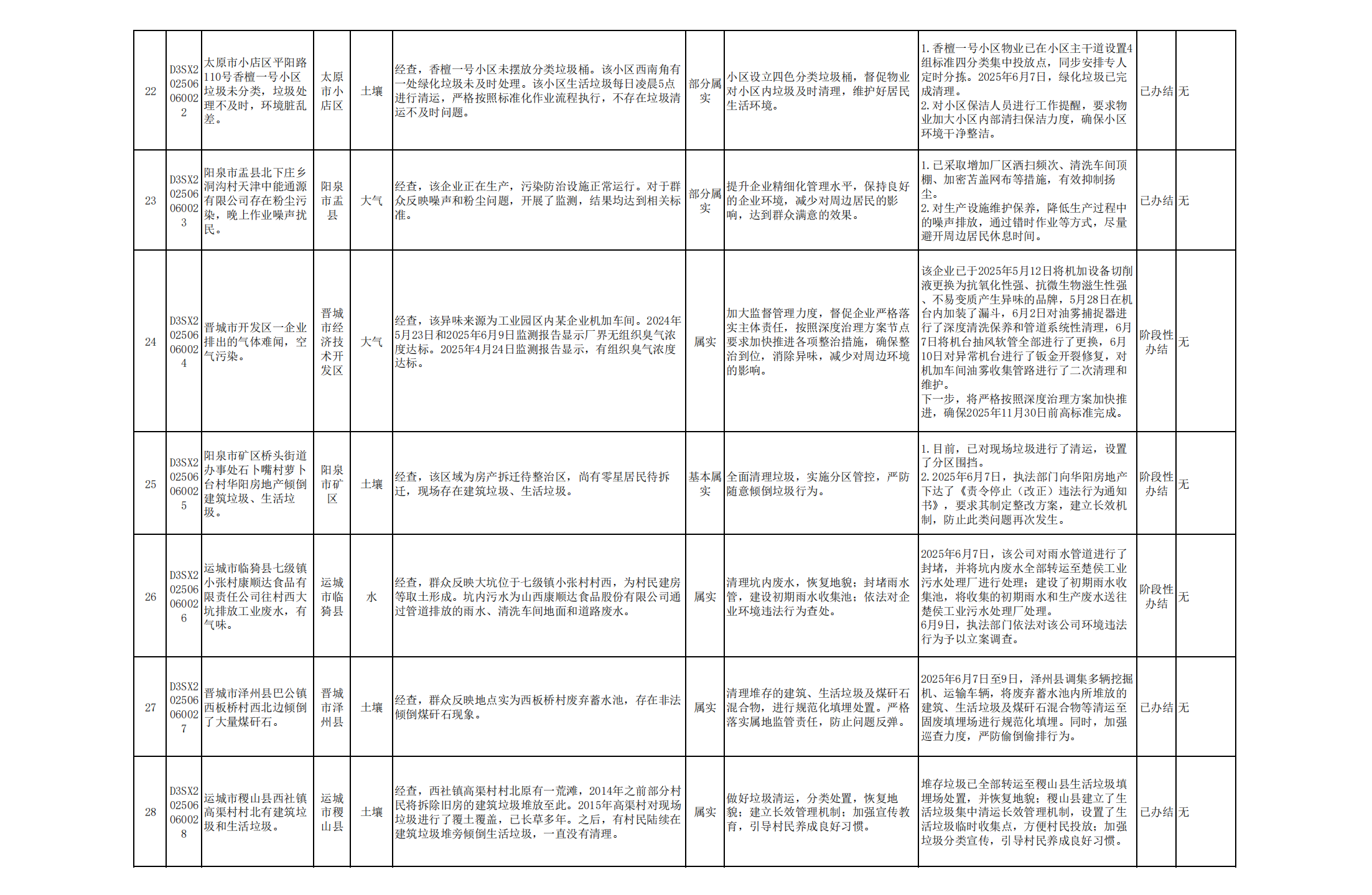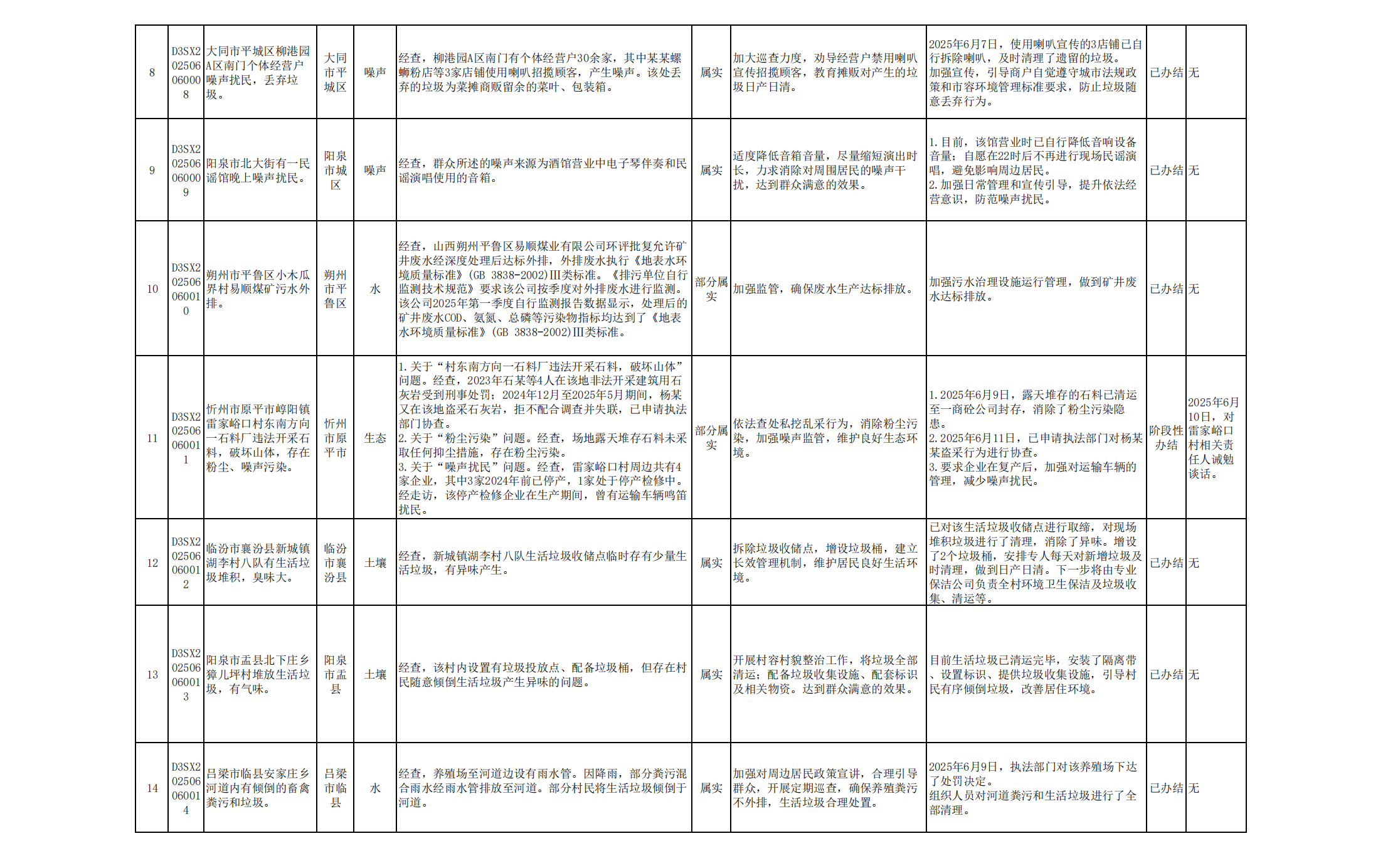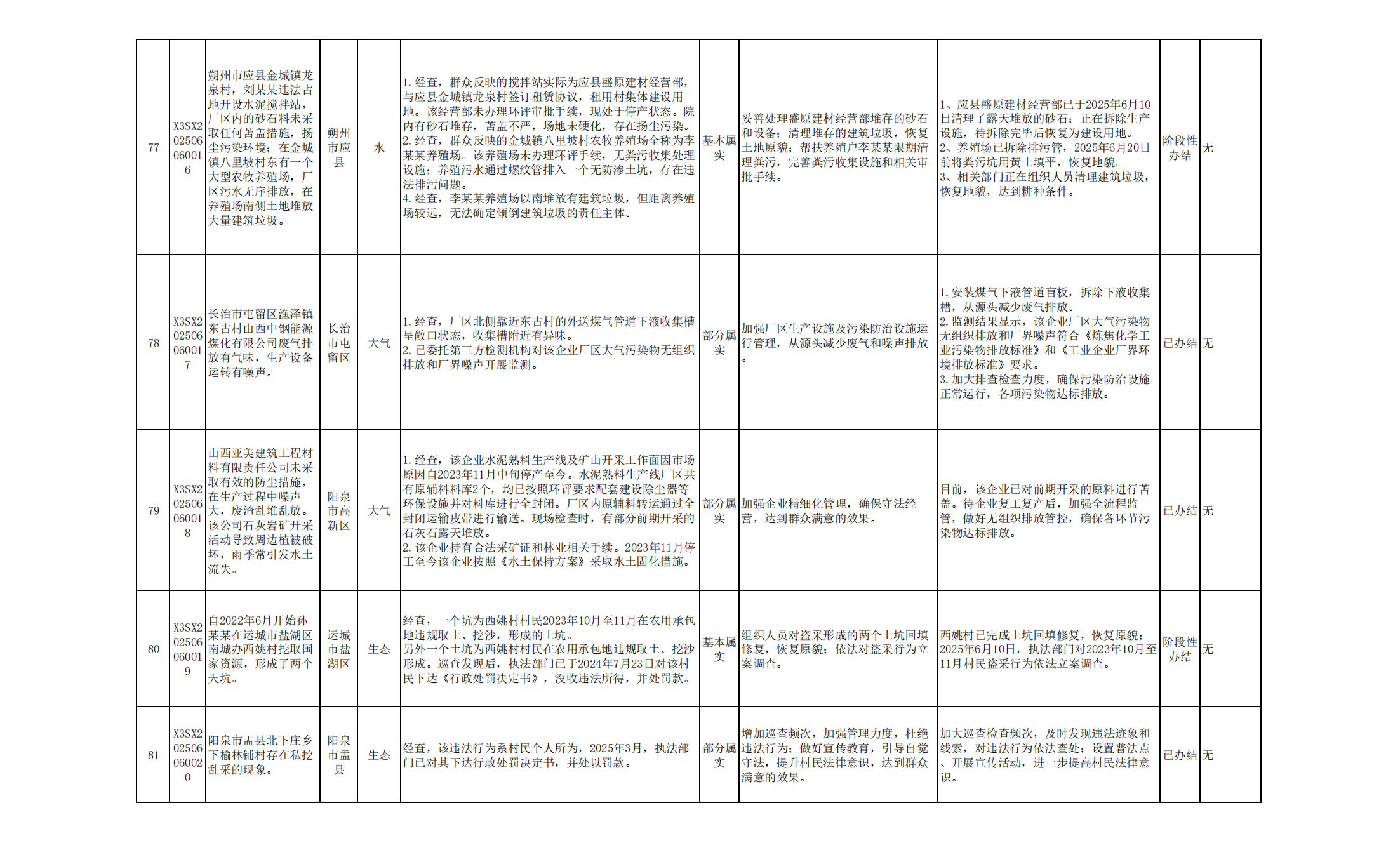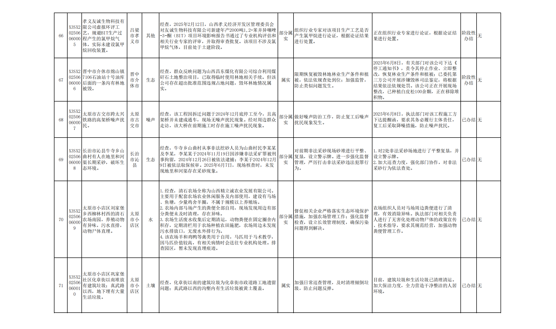 截至2025年6月15日,中央第一生态环境保护督察组向我省交办的第十批群众信访举报件86件,各责任单位均按要求上报调查处理情况。其中,已办结63件,阶段性办结23件,按照有关规定予以公开。